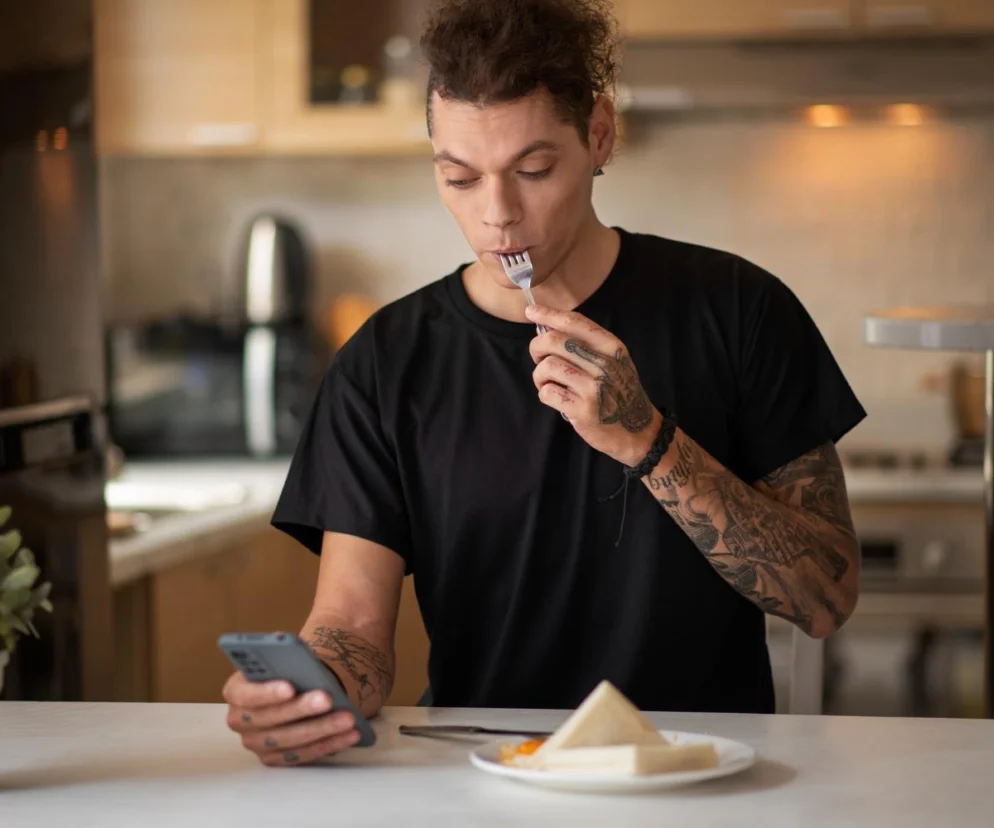 - jedzenie przed włączonym ekranem komputera lub z telefonem w ręku (to mocno odrywa naszą uwagę i sprawia, że jemy o wiele za szybko)